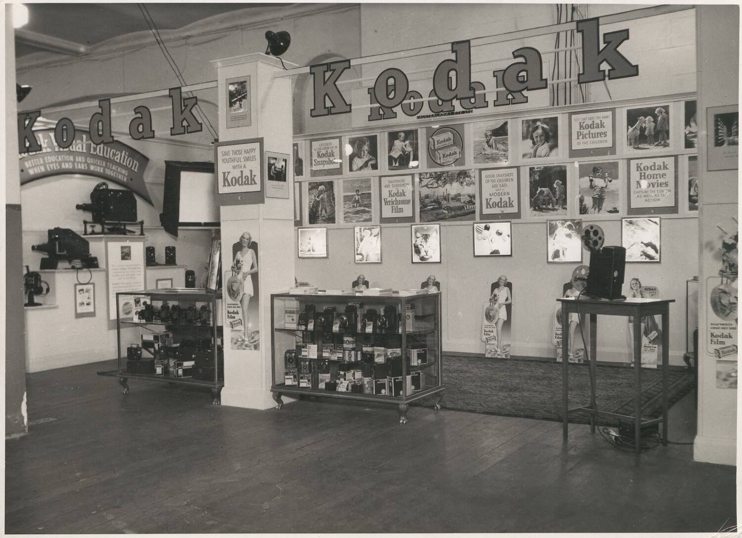 Kodak exhibition stand with framed photographs and posters mounted around the walls, two glass fronted display cabinets full of cameras and accessories, and 'Kodak' signs hanging above the display entrance. Projectors mounted on far wall beneath 'Kodak Visual Education' sign.