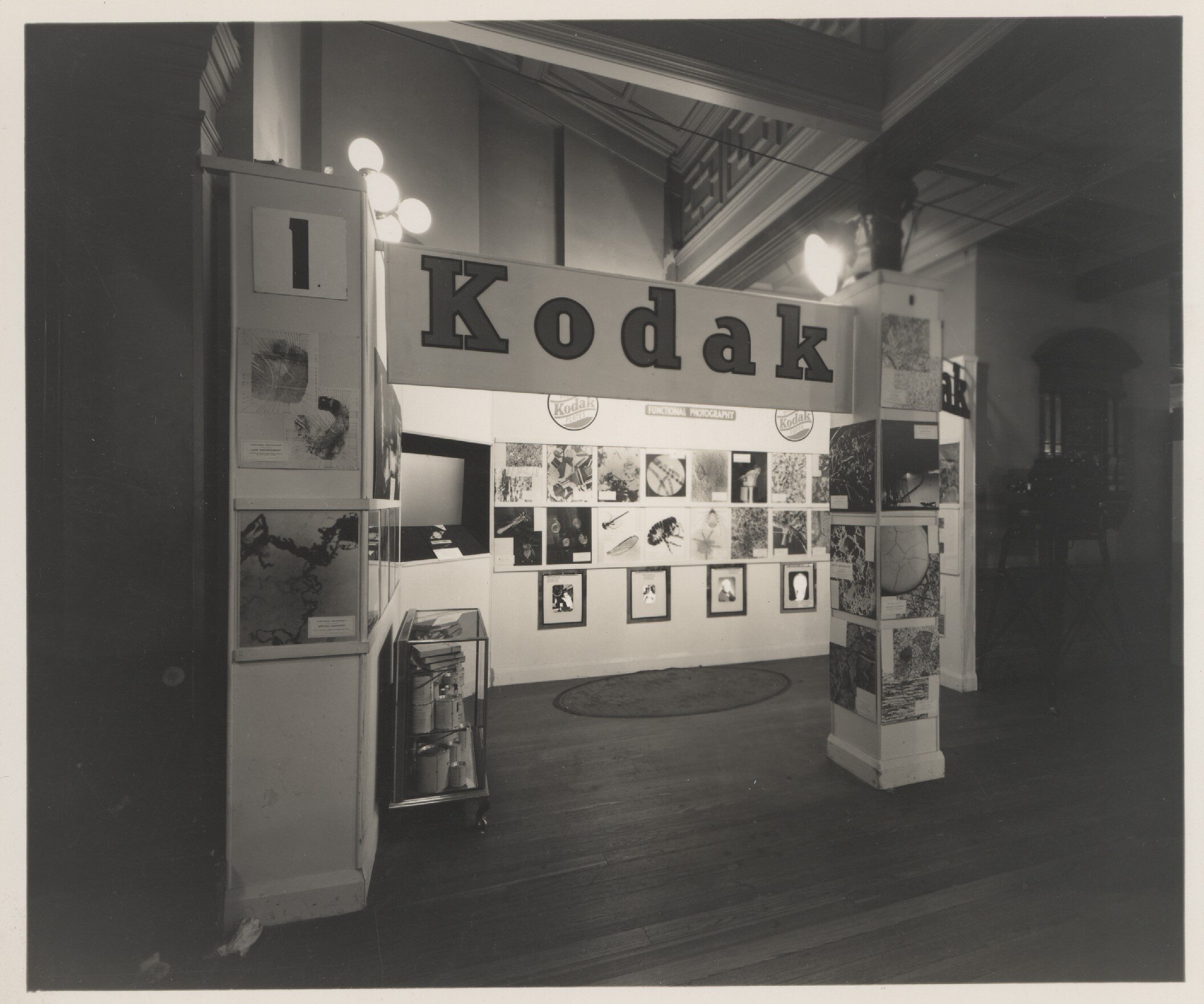 Monochrome photograph of a Kodak Australasia Pty Ltd 'Functional Photography' exhibition display stand or trade show booth at the Chemical Industries Exposition held in Sydney in September 1938. This is an angled, side view of the stand. There is a glass cabinet at one end of the display full of photographic chemicals, as well as a projection screen set into the wall, and photographs arranged around the walls and the entranceway pillar.