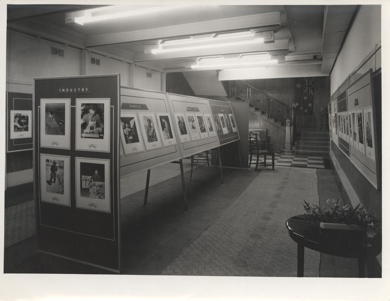 Photographic exhibition in low ceilinged room with timber staircase at the rear, decorated with the Australian flag and chequerboard tiles beneath. Photographs are mounted and affixed to display panels with carpet beneath. There is a small table with plants in the foreground.