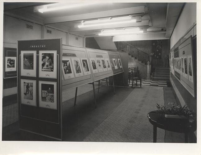 Monochrome photograph of a Kodak Australasia Pty Ltd photographic exhibition circa 1940s titled 'Meet the Australians', which features framed photographs mounted in a lower floor gallery, organised into different themes including 'People', 'Industry', 'Domestic', 'Children', 'Wine' and 'Learning'.