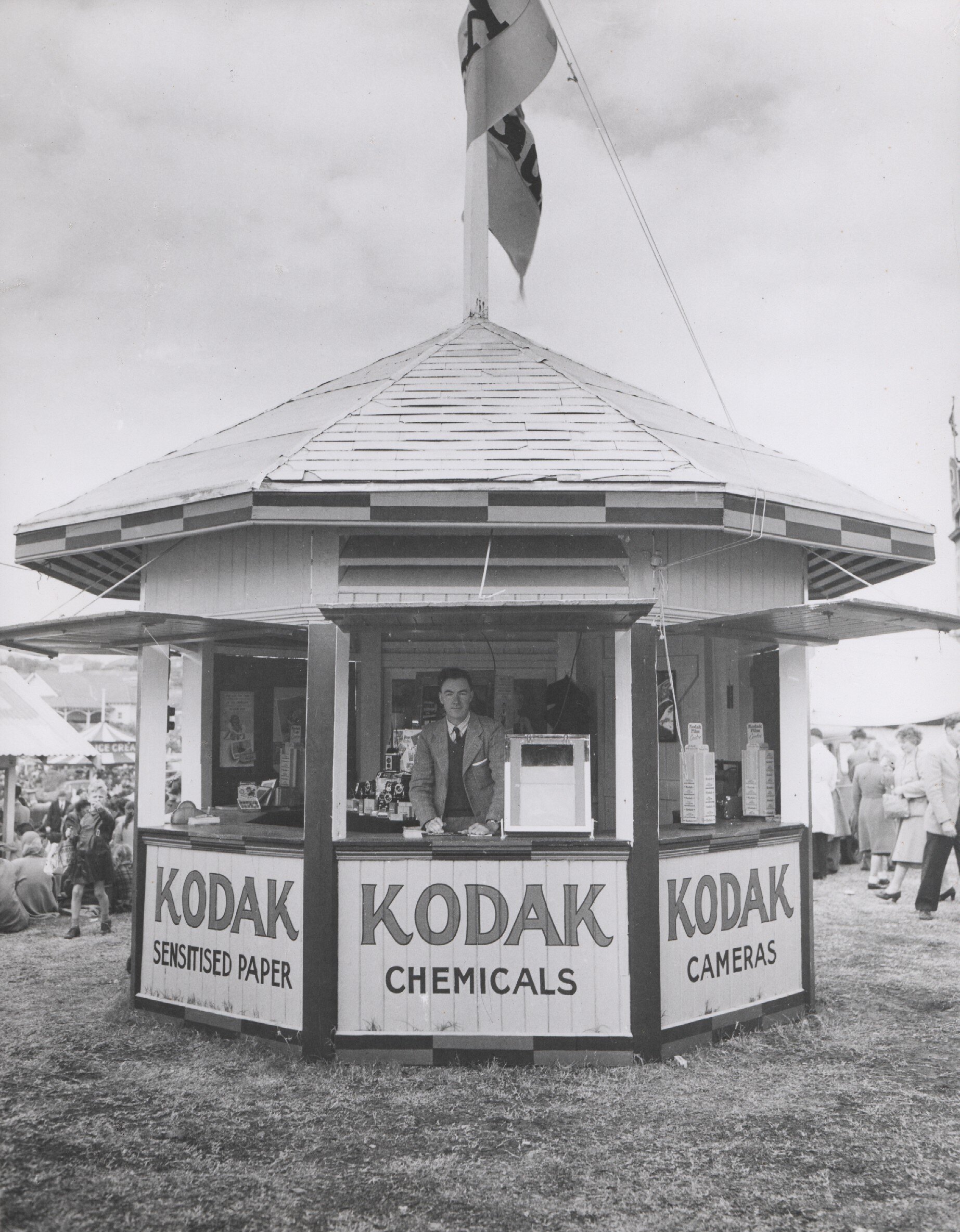 Wooden booth in grassy exhibition grounds. The booth painted with the words 'Kodak / Sensitised Paper', 'Kodak Chemicals' and 'Kodak Cameras'. The shuttered windows are opened and a man stands in the central window behind the counter smiling to camera. There are products arranged around the counter. The pointed, gabled roof leads up to a flagpole with a large Kodak flag draped from it. People and buildings visible in the background.