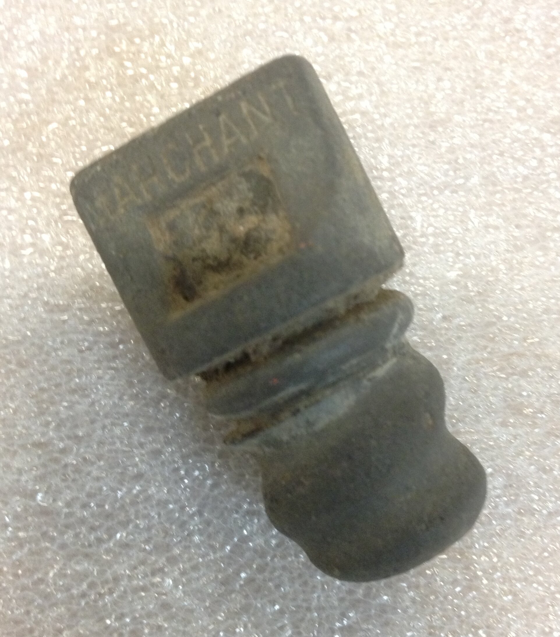 Black coloured, wood or vulcanised rubber with screw thread and flat finger hold at top. It has an imprint of the company logo for Marchant & Co., a wheel.