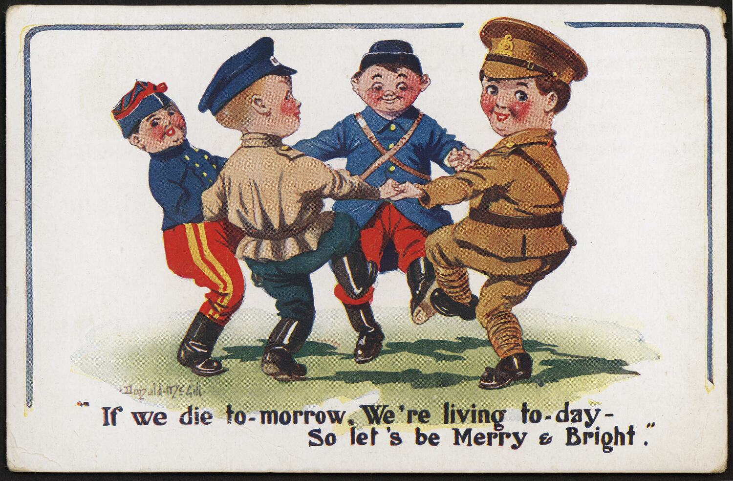 Coloured image of four dancing servicemen, holding hands in a circle. One with a brown uniform looks cheerfully at the viewer. Inscription below: 'If we die to-morrow, We're living to-day - / So let's be Merry & Bright".'