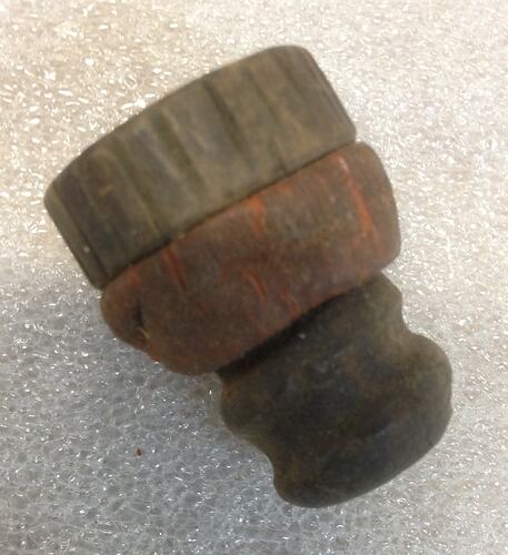 Wooden stopper with screw thread and flat round top with indentation for a flat screw driver and knurled pattern. Has a deformed, orange/red rubber seal.