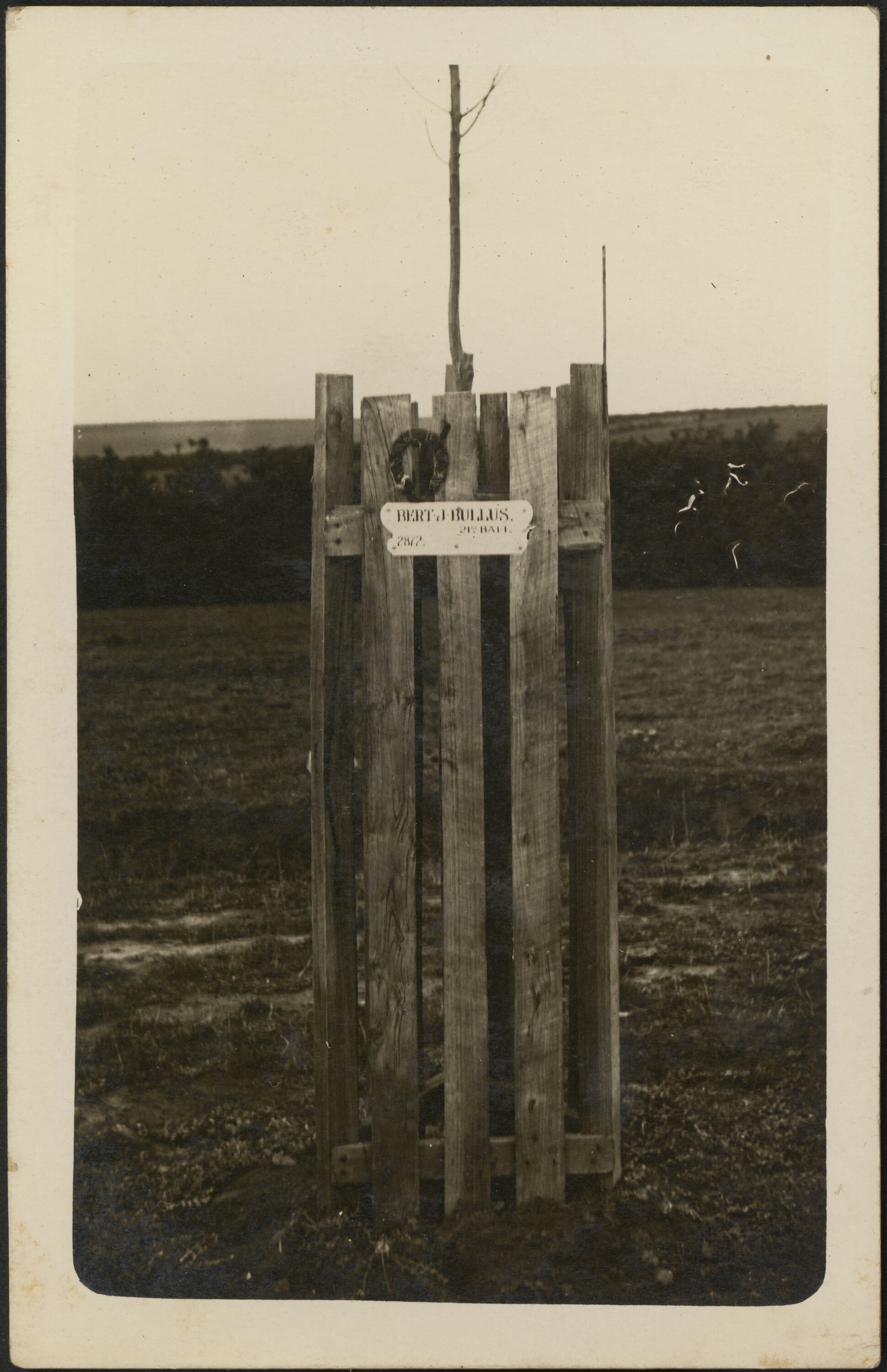 Thin tree trunk, partially visible, enclosed in a solid wooden protective cage. A label on the front of the cage reads 'BERT BULLUS'; the remainder is illegible. The treeis planted in a rural landscape with wooded central section.