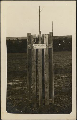 Digital image of a photograph printed onto a postcard backing, depicting Avenue of Honour tree with plaque 'Bert Bullus'. This is probably Albert Bulluss, service # 29929. He, his father and brother all enlisted to service in World War I. His father was John Isaac Bulluss (service # 1201); his brother was Joseph (# 6773). Lily Bulluss of Raglan Street Ballarat is named as their next of kin - she was John's wife and Joseph and Albert's mother. All three survived the war. The Ballarat Avenue of Honour, where they were commemorated, was completed on 9 June 1919, and included 3,700 names of those who volunteered for active service overseas. The Avenue was planted by Employees of E. Lucas and Co., and was l4 miles long.