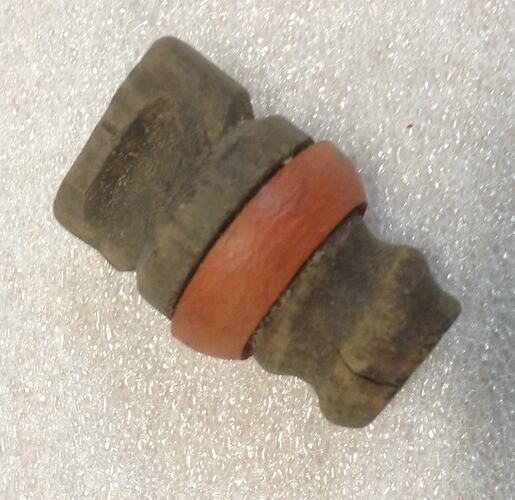Wooden stopper with screw thread and flat finger hold at top. Has an orange/red rubber seal.