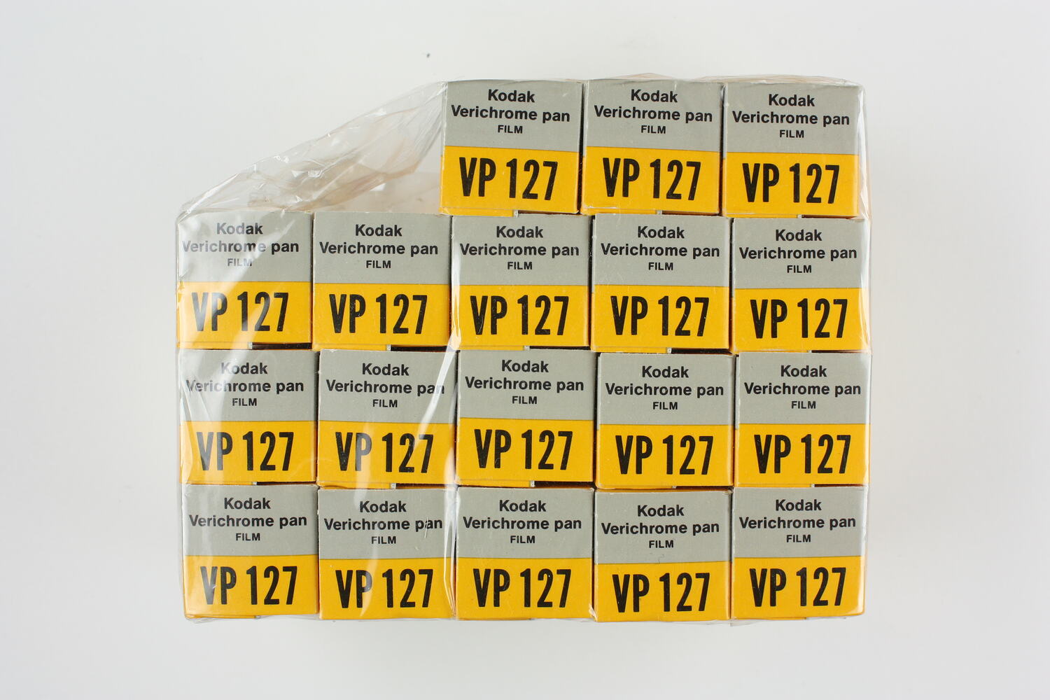 Opened pack of Kodak Verichrome 127 film spools. Boxes were sealed in clear cellophane but this seal has been broken and two boxes removed so there are only 18 boxes remaining. Each box contains one roll of film which was manufactured by Eastman Kodak Company, USA, to be developed before March 1983. Product code VP 120.