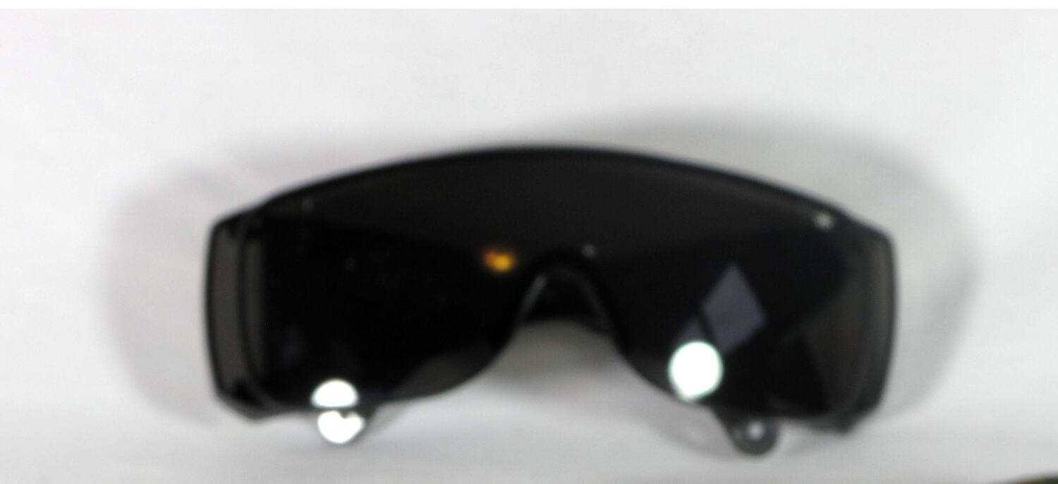 Dark protective glasses with wide arms and the depth to allow for prescription glasses underneath. Hand-made wollen, tartan pouch.