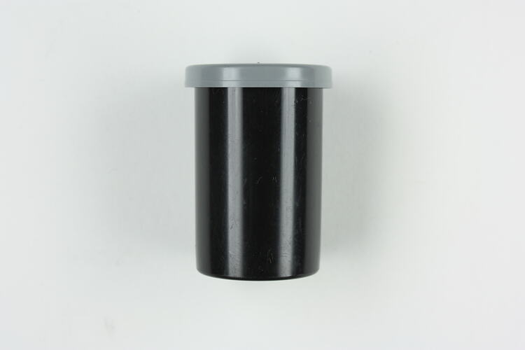 Cylindrical black plastic film canister with grey plastic lid.