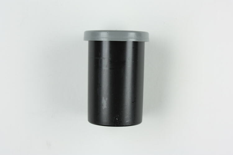 Black plastic film canister which originally housed a Kodak High Definition 200 135 format film cartridge. This cartridge comes from one of the last production runs at the Kodak Australasia Pty Ltd factory at Coburg in 2004.