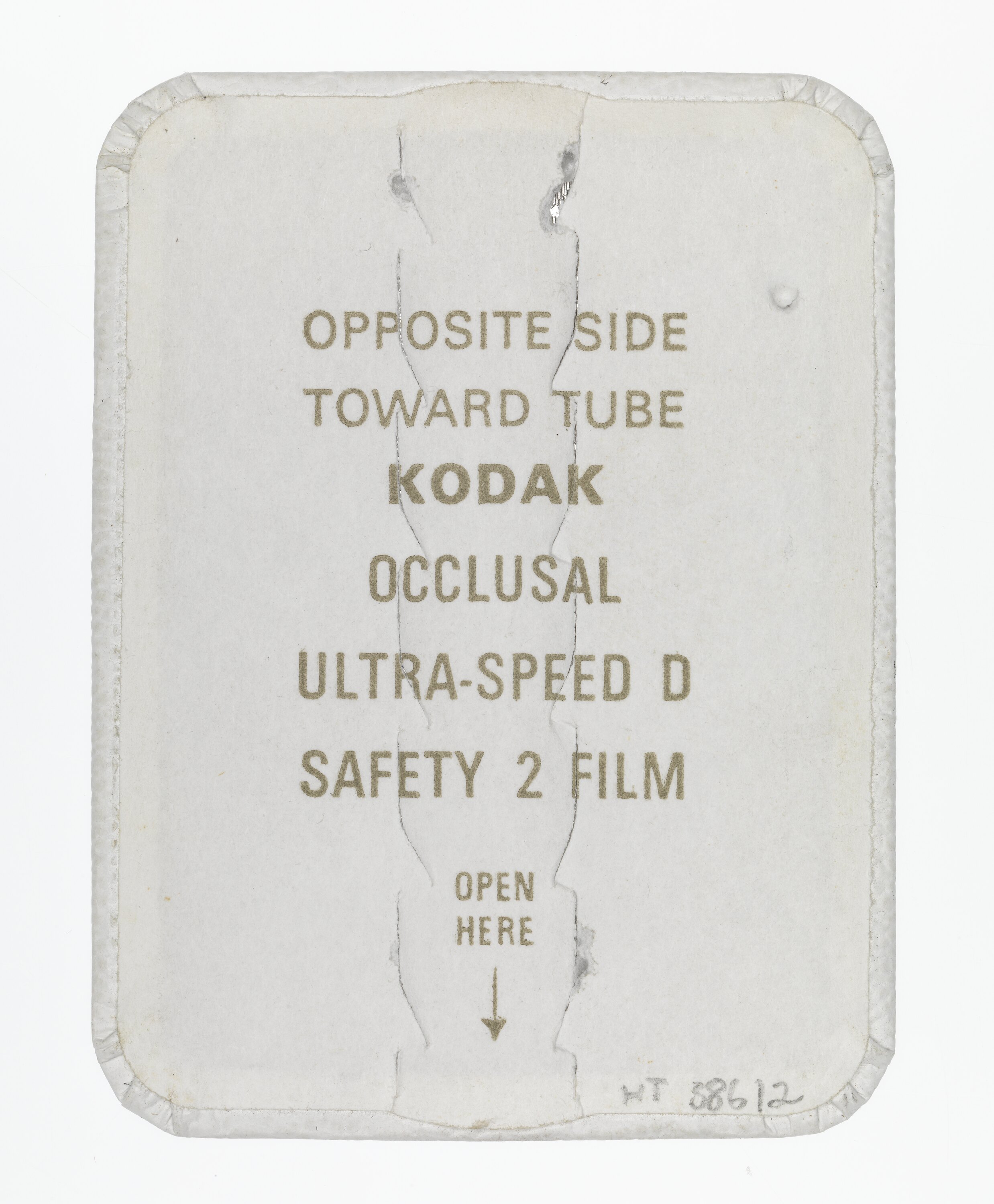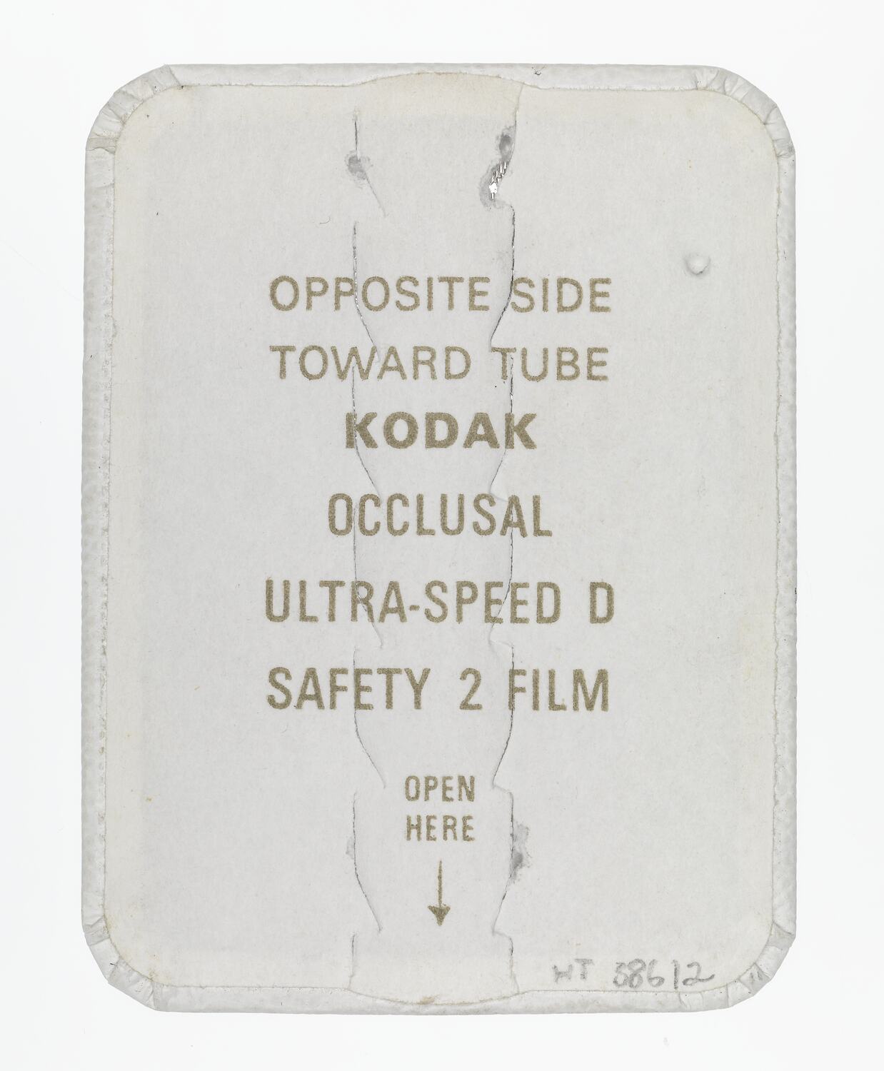 Reverse, printed, gold ink: 'OPPOSITE SIDE / TOWARD TUBE / KODAK / OCCLUSAL / ULTRA-SPEED D / SAFETY 2 FILM / OPEN / HERE [downwards arrow]'