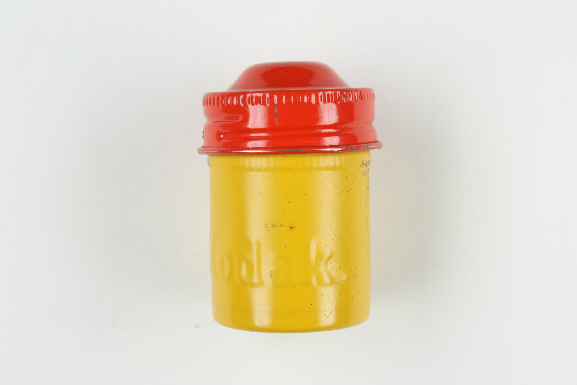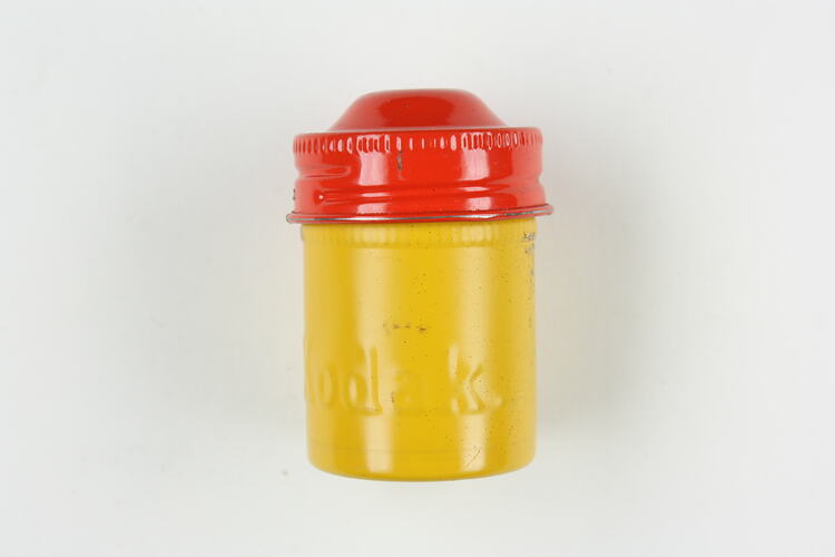 Kodak metal film canister painted in the Kodak colours of red and yellow. This is one of several canisters and a cloth film mailing bag which came together as a donation to the Kodak Museum in 1985.