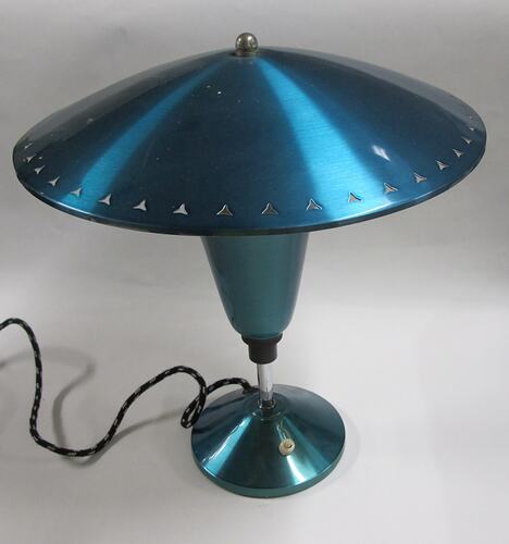 Blue anodized lamp comprising circular top, tapering to slight point at top, with triangular holes pierced around edge; attached to shaft with three rods; shaft covered in part by inverted anodised cone; and smaller circular base with white plastic switch and cord extending. Top is white on underside. Cord is black with white pattern, with white plug at end.