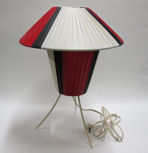 Lamp with conical shade and separate inverted tapered body, both featuring black, red and white pleated fabric. Stands on three thin metal legs, painted white. Two-ply white power cord with two pin socket at end. A 25 watt Thron brank incandescent light globe is installed in the lamp.