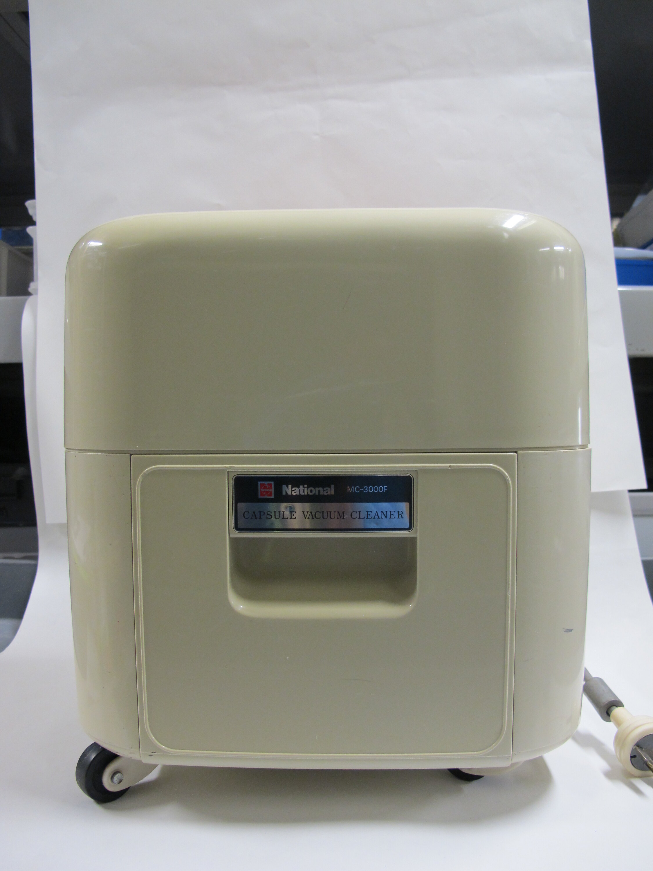 Printed on side label: 'National / MC-300F / CAPSULE VACUUM CLEANER'. Printed on label at power cord: 'REMOVE PLUG FROM POWER POINT / BEFORE RETRACTING CORD. / FOR THE REPLACEMENT OF FLEXIBLE / CORD, PLEASE RETURN TO THE AU- / THORIZED NATIONAL SERVICE CENTER.' Printed on inside label: 'National / MC-300F / ON/OFF / Capsule Vacuum Cleaner / INDICATOR'.