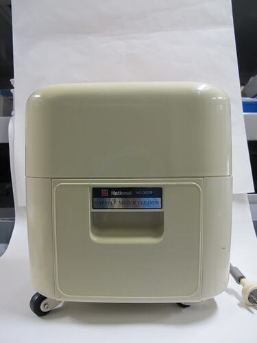 In December 1973 the Australian Women's Weekly advertised this National Capsule vacuum cleaner as a 'self-contained' unit, 'delightfully house-trained' and looking 'more like a piece of modern furniture. Just take off its vinyl-padded lid and all the attachments you'll need are snugly packed inside. That includes four nozzles - one adjustable to all floor surfaces - one for crevice work - another for upholstery and a dusting brush. There's also a telescopic wand that stretches right out. And the nattiest - thing of all - a capsule dust catcher with level indicator that does away with dust bags entirely. In fact, it even cleans itself each time you draw out the power cord. Sold? You will be when you see it. The National Capsule Cleaner. Use it for a footstool or seat when it's not purring around the house. It's completely self-contained, and just one of the 10 National vacuum cleaners that are all slightly ahead of their time.' (Australian Women's Weekly, 5 December 1973, p.56)