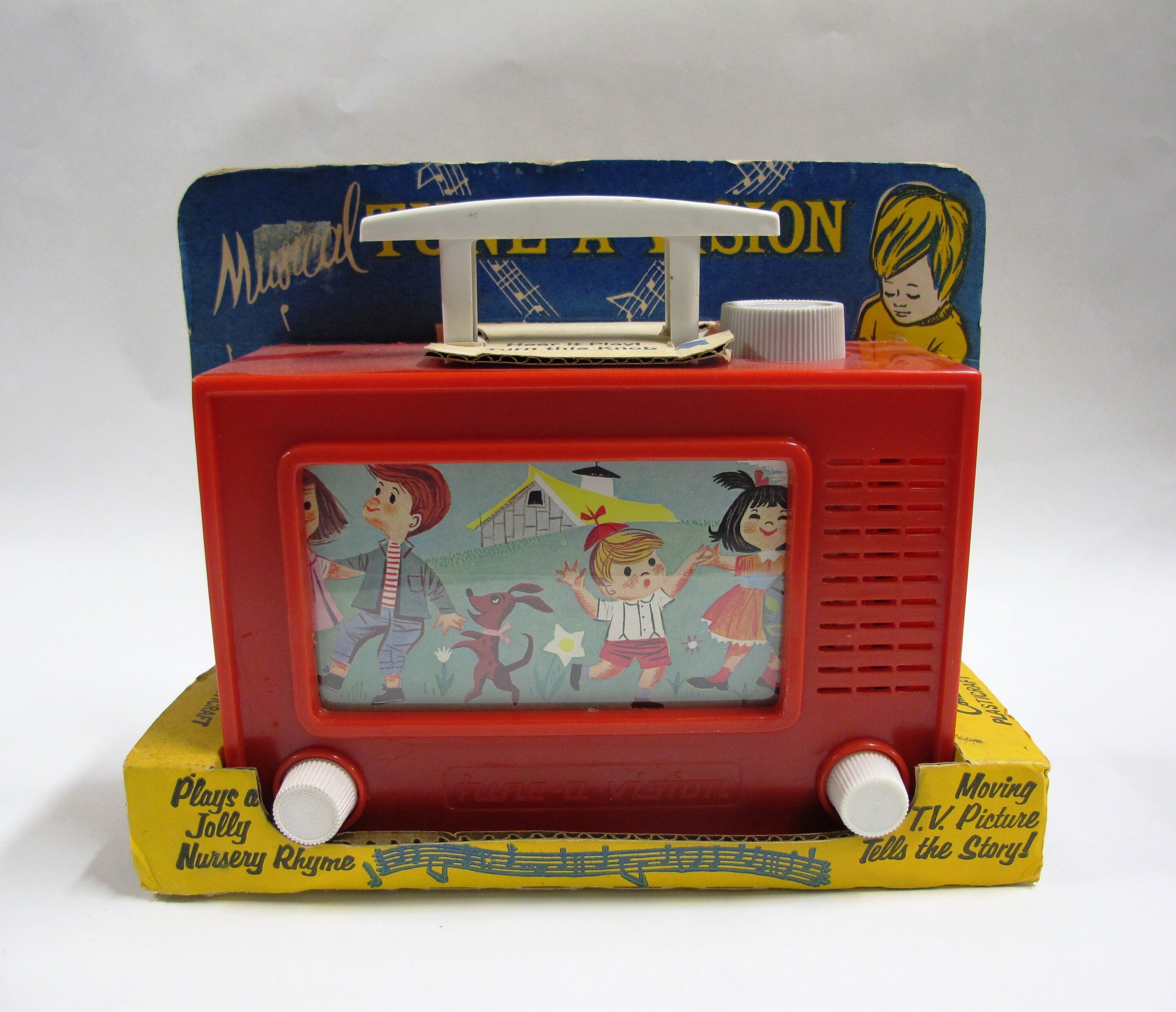 Red plastic box with white handle at top and knob; two knobs at front which, when turned, scroll a series of cartoon images. Turning the top knob winds the mechanism, so that music plays as the image scrolls. The box is mounted in its original cardboard packaging, printed in blue and yellow, with an image of a boy with eyes closed, and musical notes about.