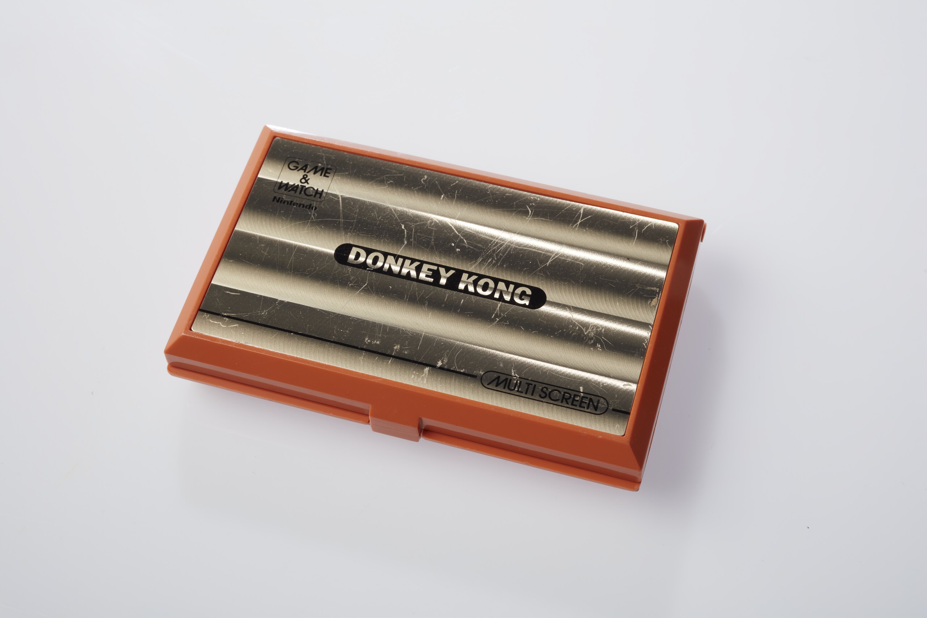 Nintendo Donkey Kong game in small orange plastic game console, dated 1982. The Donkey Kong 'Game & Watch' was based on the Nintendo arcade game of the same name, released in 1981. The concept was developed by Nintendo employee Shigeru Miyamoto. The name Donkey Kong refers to a stubborn (as a donkey) primate. Donkey Kong tries to hinder the progress of 'Jumpman' up a highrise scaffold, as he tries to rescue his girlfriend.