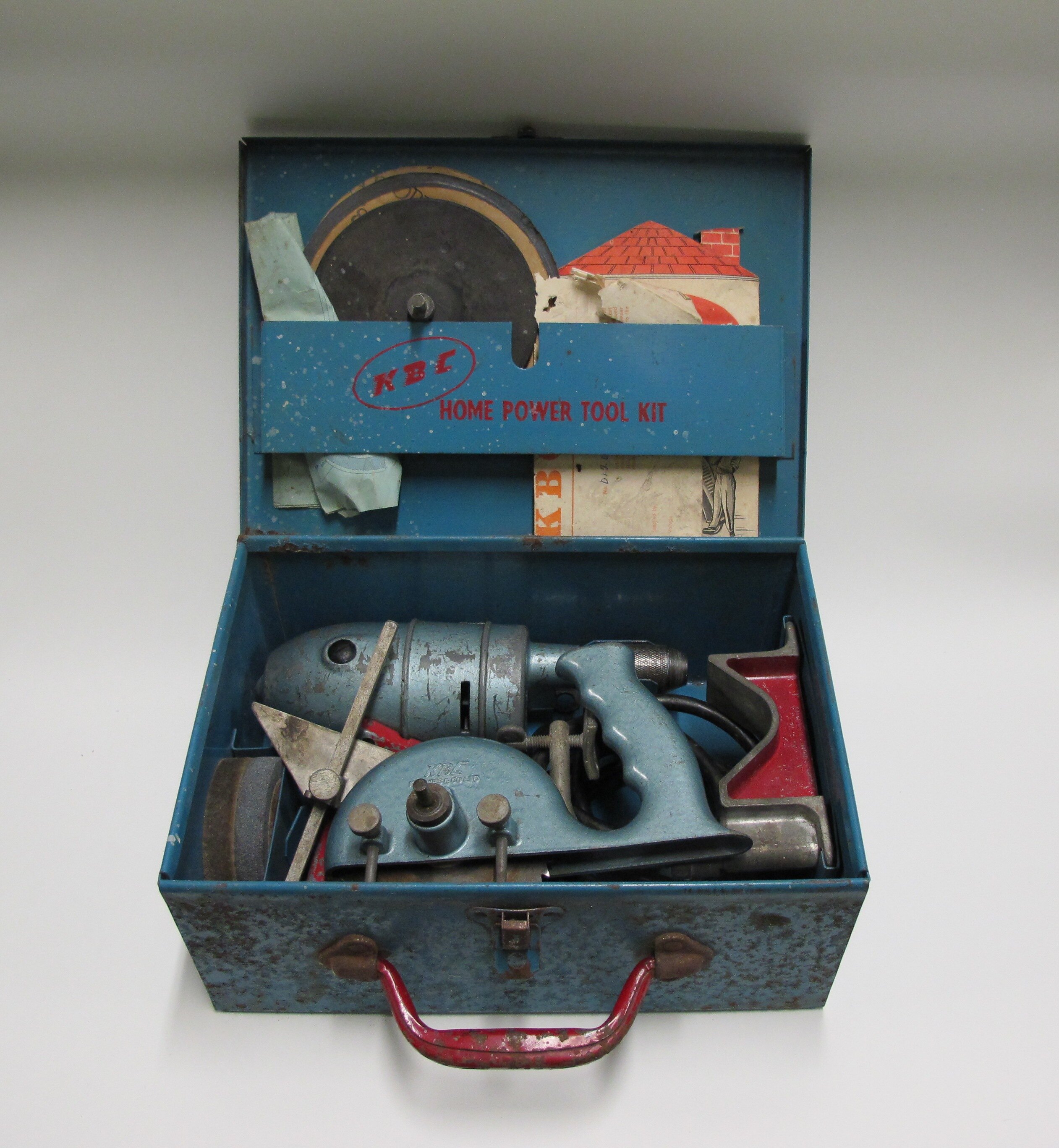 Power tool kit in blue metal box made by KBC - Ken Bowes & Co. Ltd, Woodlands Park, South Australia. It comprises a drill with several attachments: saw, sander, polisher, grinder and buffer - 'for 100 jobs in every home'. It was advertised in Australian newspapers between 1953 and 1954, for around £21.