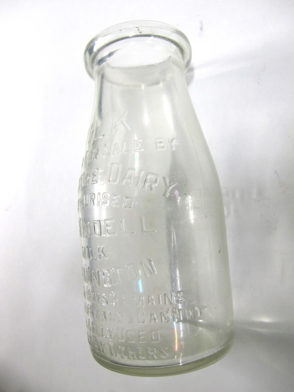 Small glass milk bottle, tapering in to heavy lip at opening, and raised inscription on both sides.