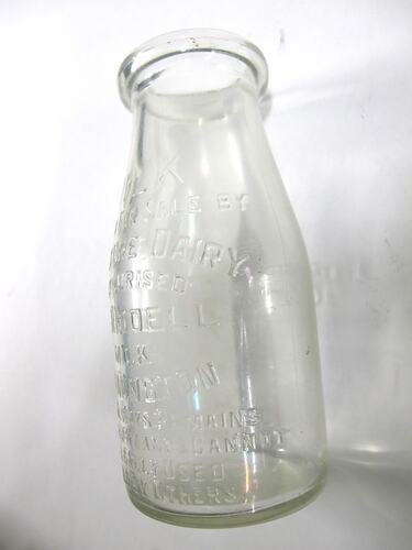 The milk bottle was used as a prop in the 'House Secrets' exhibition at Scienceworks, 6 March 2006 to 14 July 2013. Most of the props for the exhibition were sourced from opportunity shops in 2002 and 2003 by curator Andi Horvarth and other Museum Victoria staff. 'House Secrets' aimed to 'Explore the science behind all the familiar things in our homes', presenting 'all sorts of wonderful things we might find around the home, from the food we eat, to the appliances we use, to the animals we share our living space with.' The exhibition was 'highly interactive'.