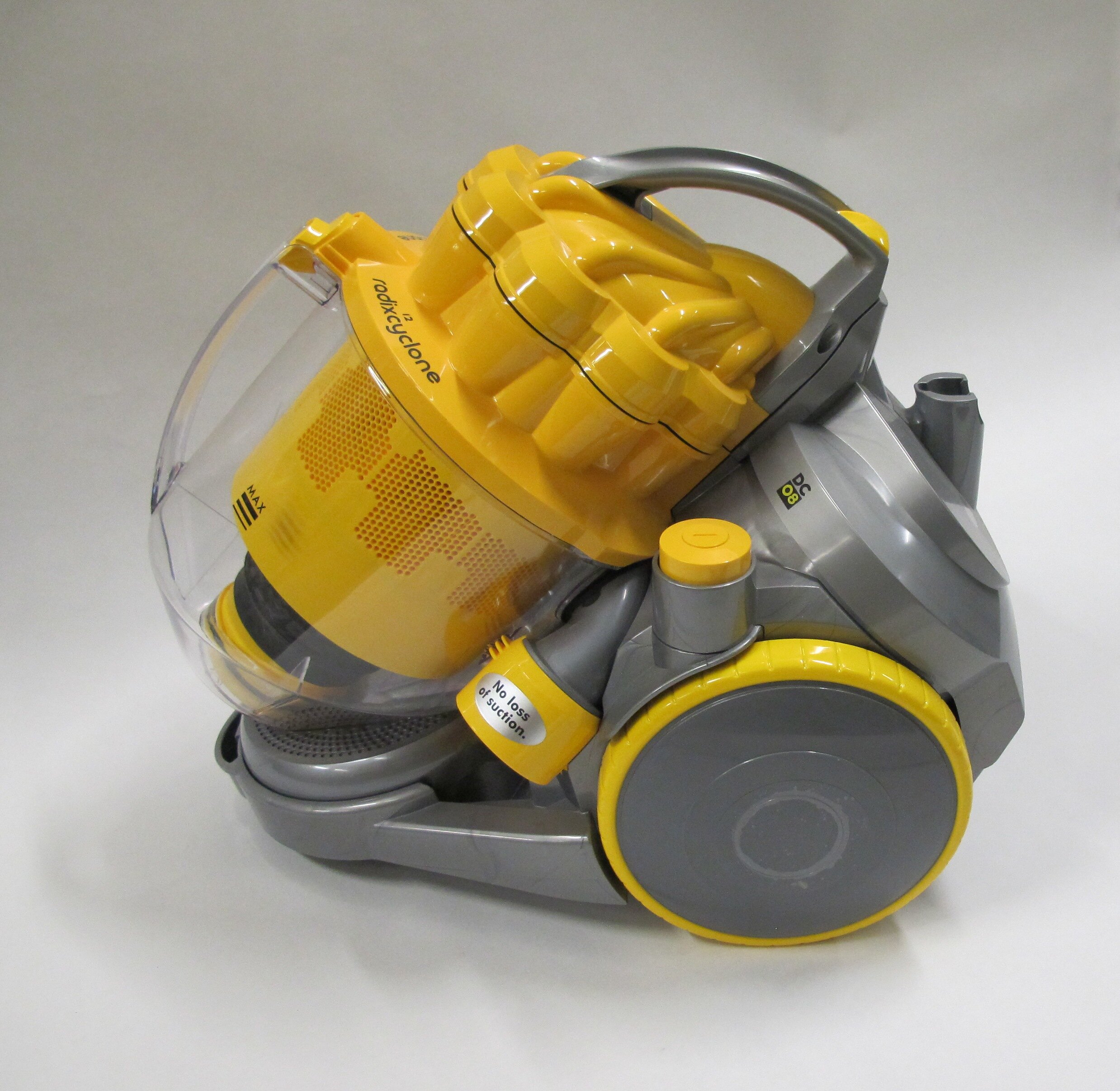 Dyson Radix Cyclone barrel-style vacuum cleaner with yellow and grey body.