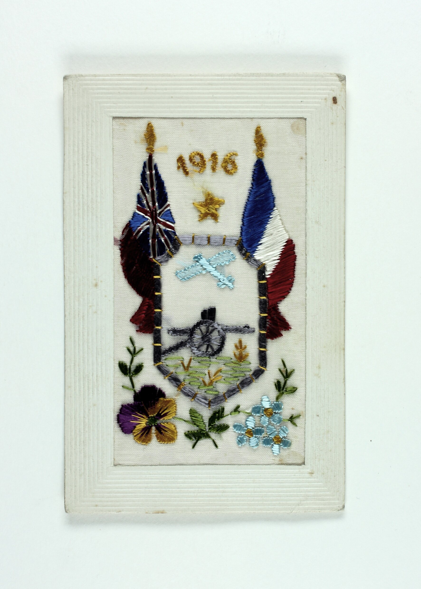Embroidered postcard depicting an aeroplane flying over a canon, flanked by the British and French flags, set over a pansy and forget-me-not flowers. Date above in yellow thread '1916'. Printed and hand-written on back. Staining throughout.