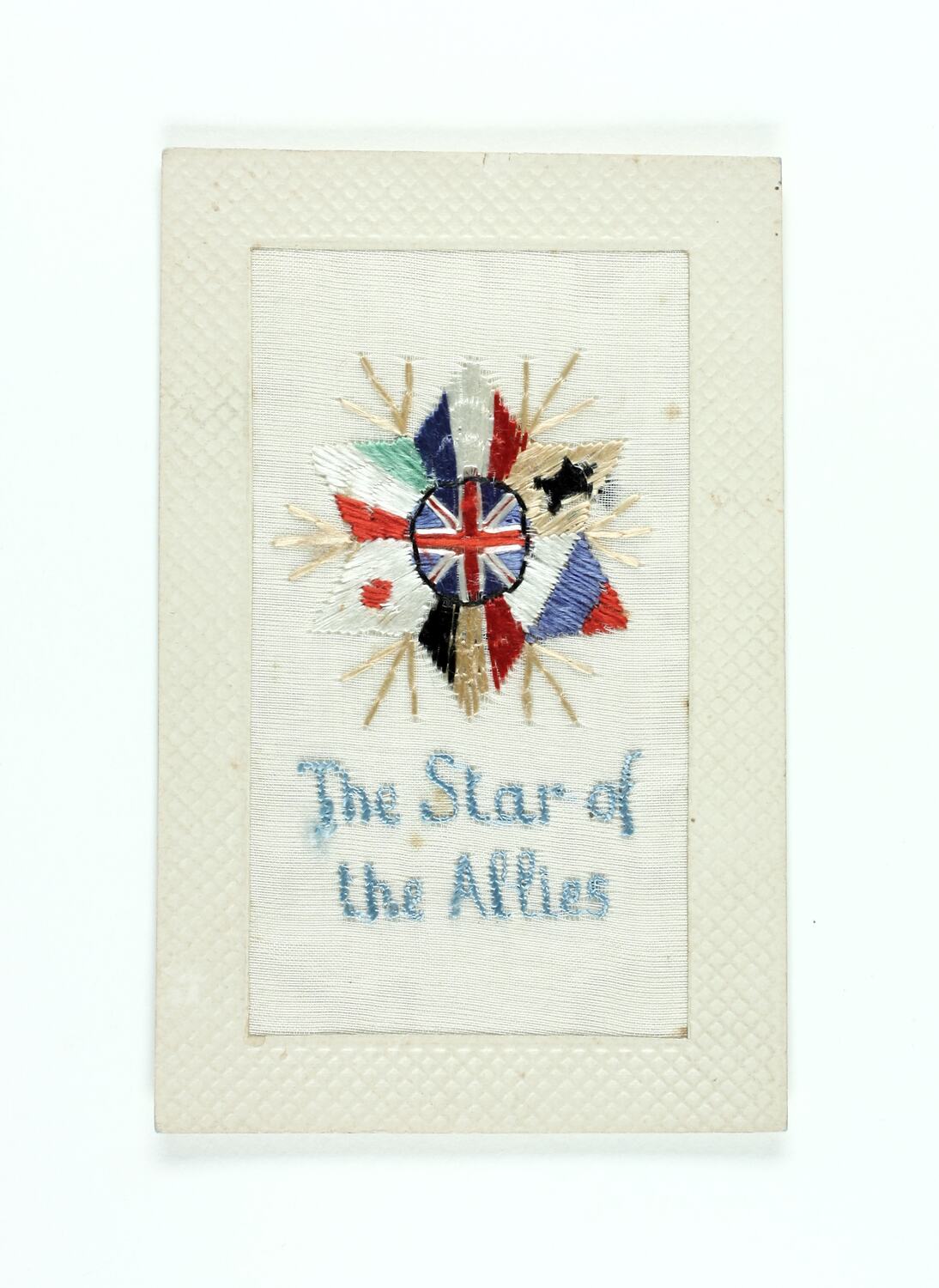 Embroidered postcard featuring six flags of the allied nations, arranged in a star with the Union Jack at the centre, and inscription below in blue 'The Star of the Allies'. The embroidered panel sits within an embossed frame of off-white card. Printed and extensive hand-written text on reverse.