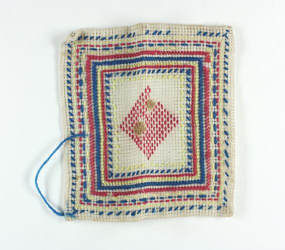 Sample of sewing on cream-coloured double mesh or penelope needlepoint canvas (ie. pairs of threads in warp and weft). The sample has been worked with blue, red and yellow wool in concentric patterns around the edges. A diamond shape has been created in the centre using running stitch. Two brown circles have been worked within this shape.