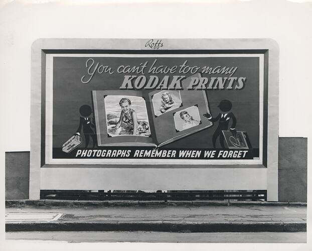 Black and white photograph of a large promotional Kodak billboard with the slogan 'You Can't Have Too Many Kodak Prints' and 'Photographs Remember When We Forget', with an image of a large photo album held by two cartoon men, one holding a film carton and the other a book of Kodak prints. The billboard, leased by Roffs, an advertising company, was likely posted in Sydney, circa 1950s.