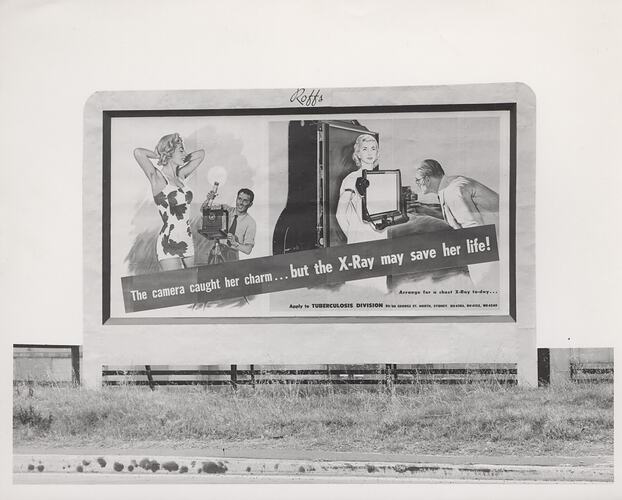 Black and white photograph of a large promotional billboard promoting X-Ray imaing for the Tuberculosis Divison, with the slogan 'The Camera Caught Her Charm...But the X-Ray May Save Her Life: Arrange for An X-ray Today'. There are two illustrations on the billboard - one of a woman in a bathing suit being photographed in a studio with a large studio camera, and another of a woman in a gown having a chest x-ray. The billboard, leased by Roffs, an advertising company, was likely posted in Sydney, circa 1950s.
