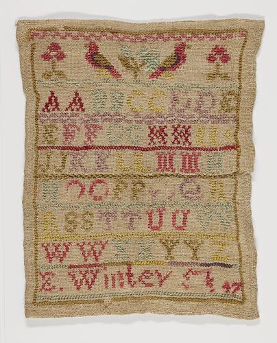 Embroidered, coloured wool: Alphanet followed by 'E. Winter (illegible due to damage) 47'.
