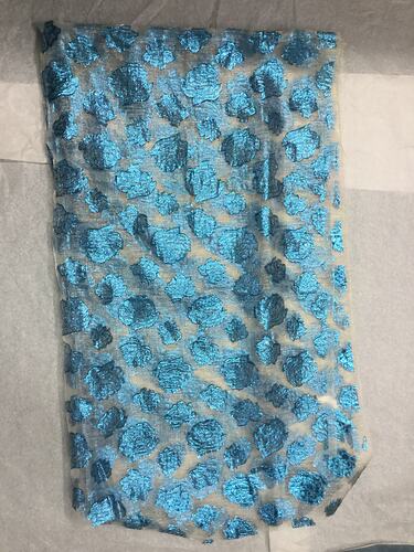 Blue rose patterned fabric wrap, worn by Bernice Kopple as part of one of her cabarets act during the 1960s. The costume also includes a matching pair of harem pants. Bernice migrated from Scotland to Australia in 1950.
