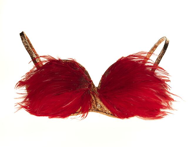 Brassiere adapted for costume use with red feather and copper lurex fabric, worn by Bernice Kopple as part of one of her cabaret acts during the 1960s. Bernice migrated from Scotland to Australia in 1950.