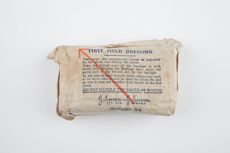 Printed in blue ink on the front of the package: 'FIRST FIELD DRESSING / Tear apart the uncemented corner as indicated / by the arrow and remove the paper. / Take the folded ends of the bandage in each / hand, and, keeping the bandage taut, apply the / gauze pad to the wound, and fix the bandage. / In the case of head wounds when respirators have / to be worn, care should be taken to adjust the pad / so that it does not interfere with the fit of the face / piece. / DO NOT HANDLE THE GAUZE OR WOUND / Johnston + Johnson / PTY. LTD. SYDNEY / DECEMBER, 1942'.