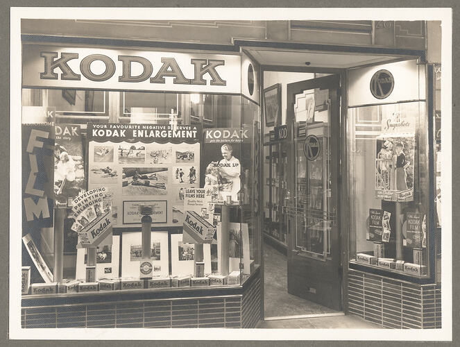 This is one of a collection of fourteen photographs, mounted on cardboard album pages with captions, of Kodak Australasia Pty Ltd's retail store on Hay Street, Perth. These images are part of the Kodak collection of products, promotional materials, photographs and working life artefacts collected from Kodak Australasia in 2005, when the Melbourne manufacturing plant at Coburg closed down.