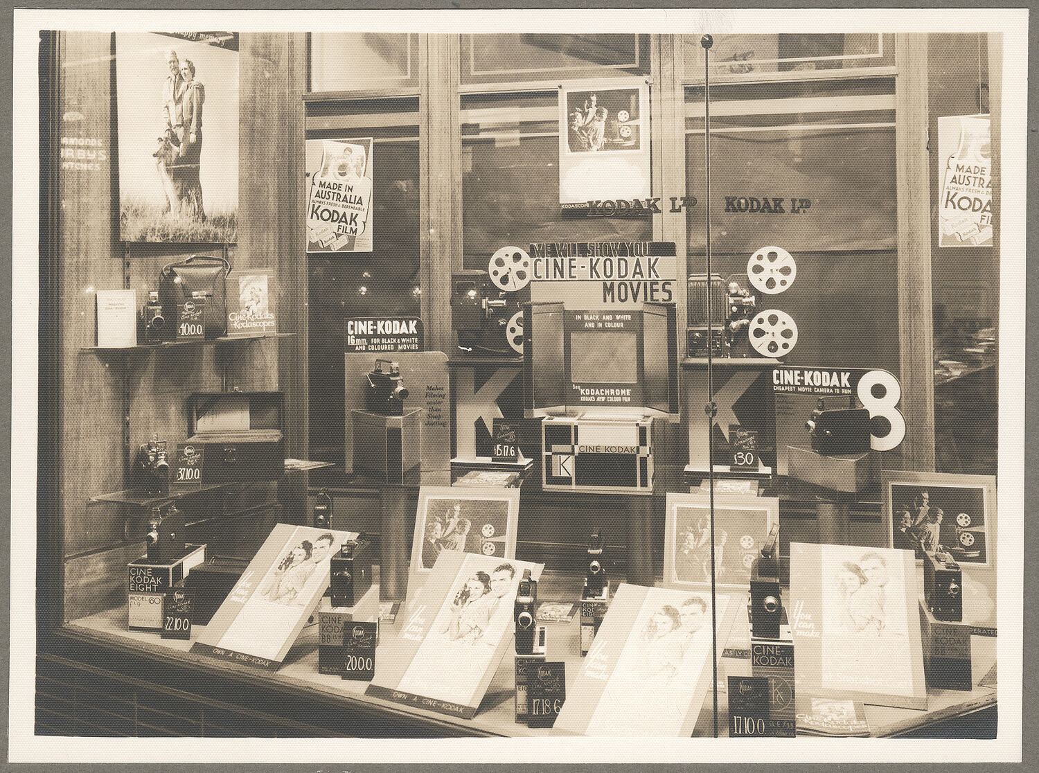 Black and white photograph captioned 'Display Windows Plaza Arcade' featuring a close up of one of the display windows of the Kodak Australasia Pty Ltd Store in Perth, circa 1930s, promoting the Cine-Kodak. This store on Hay Street also backed onto Plaza Arcade and had a wholesale dealer at the Plaza Arcade end of the store.