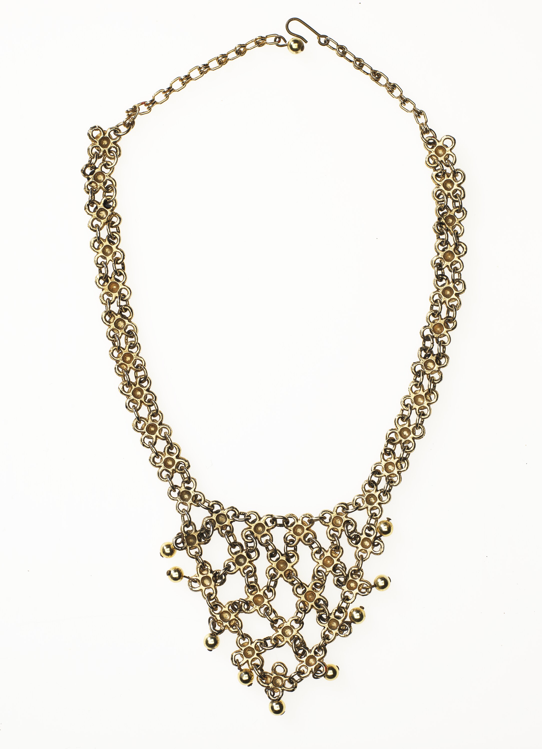 Gold metal necklace with a drop central piece and red painted detailing, possibly worn by Bernice Kopple as part of one of her cabaret acts between the 1960s and 1970s. Bernice migrated from Scotland to Australia in 1950.