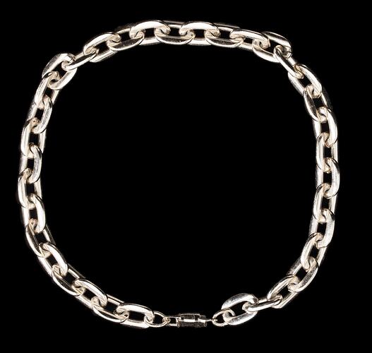 Silver metal necklace of large chain links, possibly worn by Bernice Kopple as part of one of her cabaret acts between the 1960s and 1970s. Bernice migrated from Scotland to Australia in 1950.