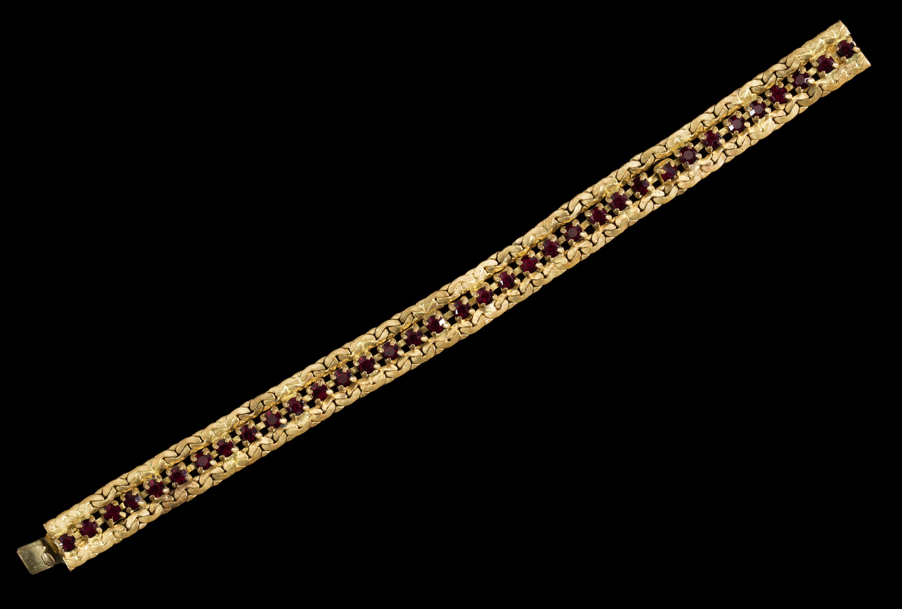 Gold metal bracelet with black glass stones, possibly worn by Bernice Kopple as part of one of her cabaret acts between the 1960s and 1970s. Bernice migrated from Scotland to Australia in 1950.