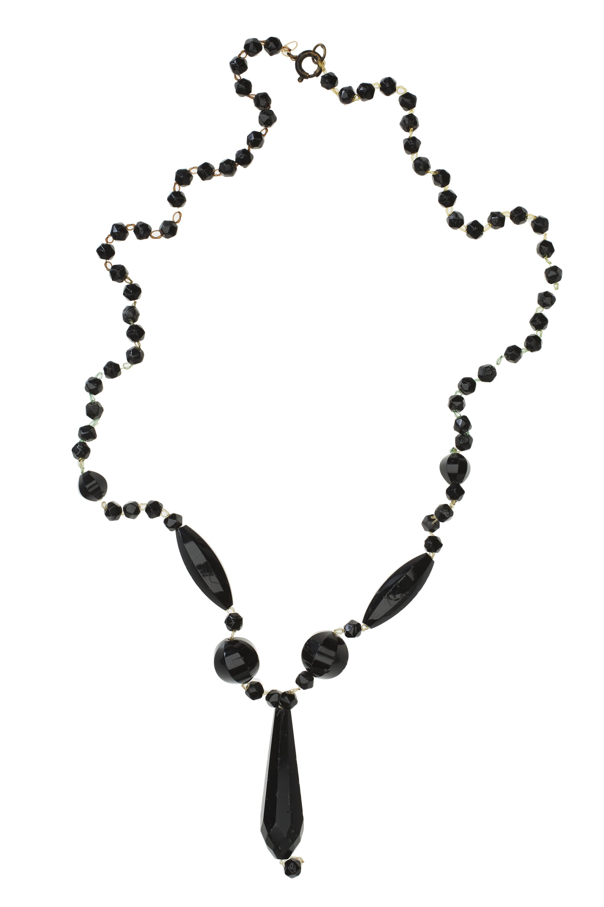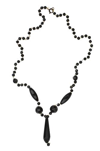Necklace consisting of a single string of black glass beads with four large black glass beads and a tear-drop shaped glass bead as centre detail. Clasp at the back.