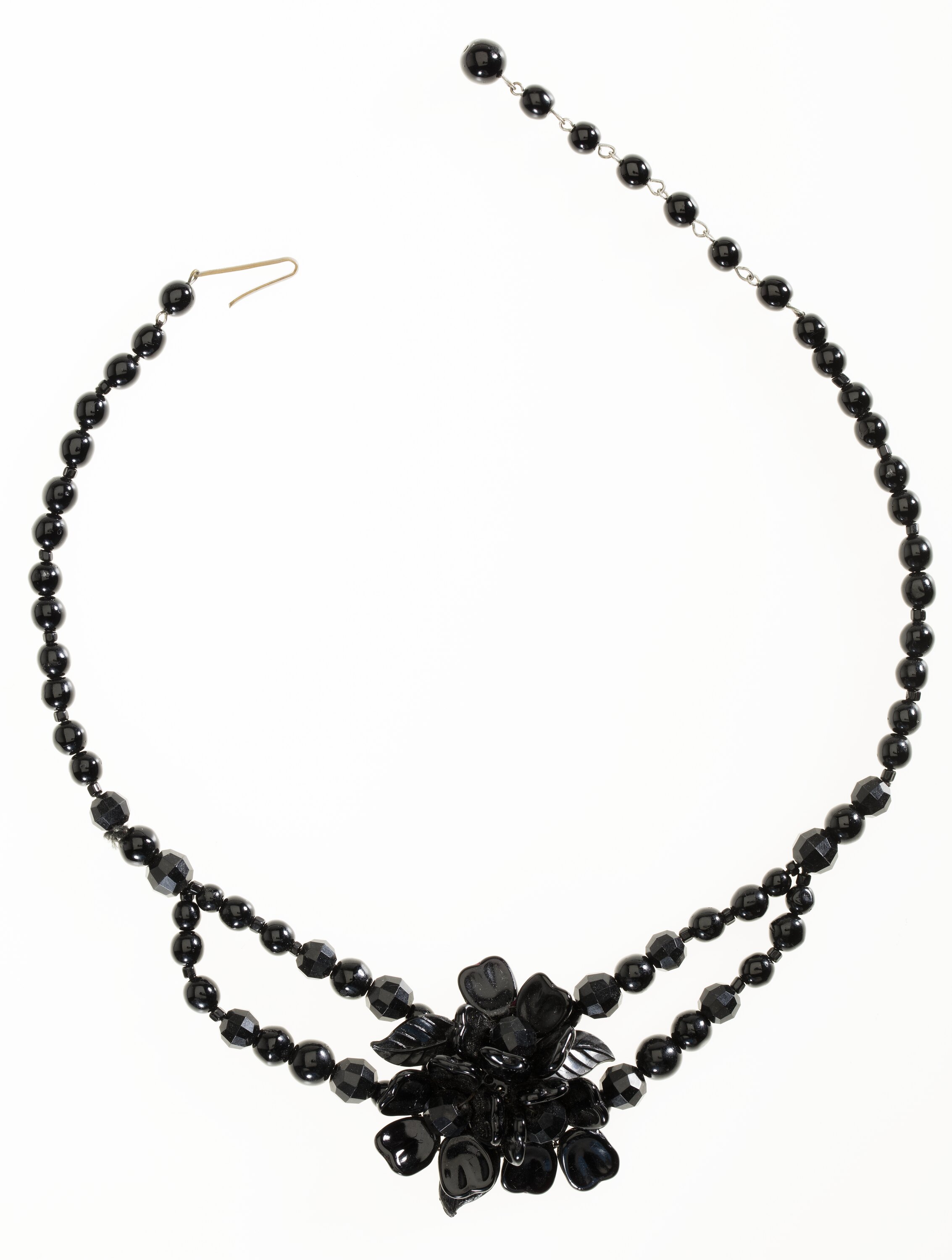 Necklace consisting of a single string of black plastic beads which then loop to form a double strand fixed at centre by a flower-shaped central decoration. Hook clasp at the back.
