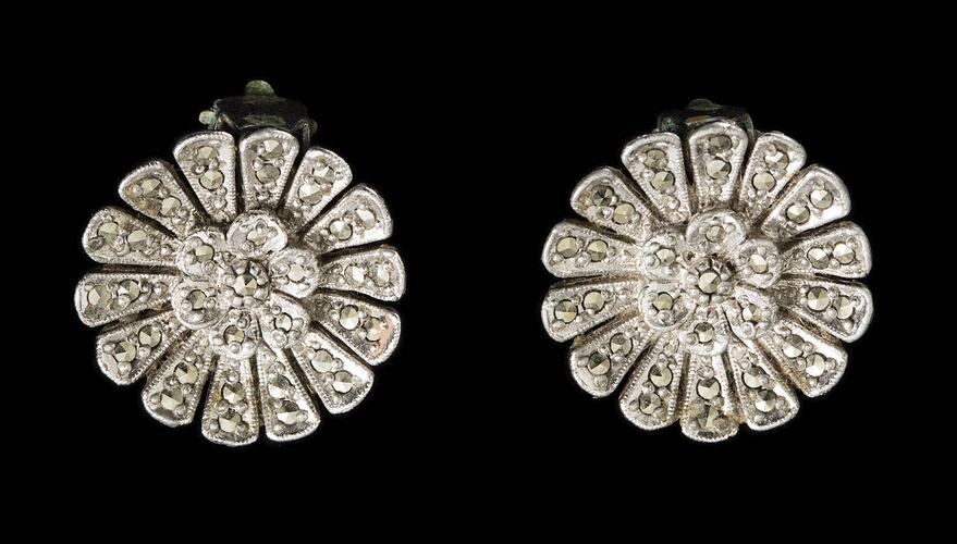 Pair of silver clasp earrings in a daisy shape with diamante decoration, worn by Bernice Kopple between the 1960s and 1980s. There is also a matching ring (HT38809). Bernice migrated from Scotland to Australia in 1950.