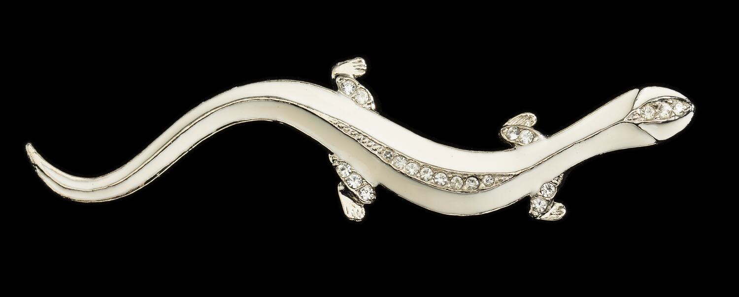 Brooch in the shape of a lizard with white enamel and diamente detailing, worn by Bernice Kopple between the 1960s and 1980s. Bernice migrated from Scotland to Australia in 1950.