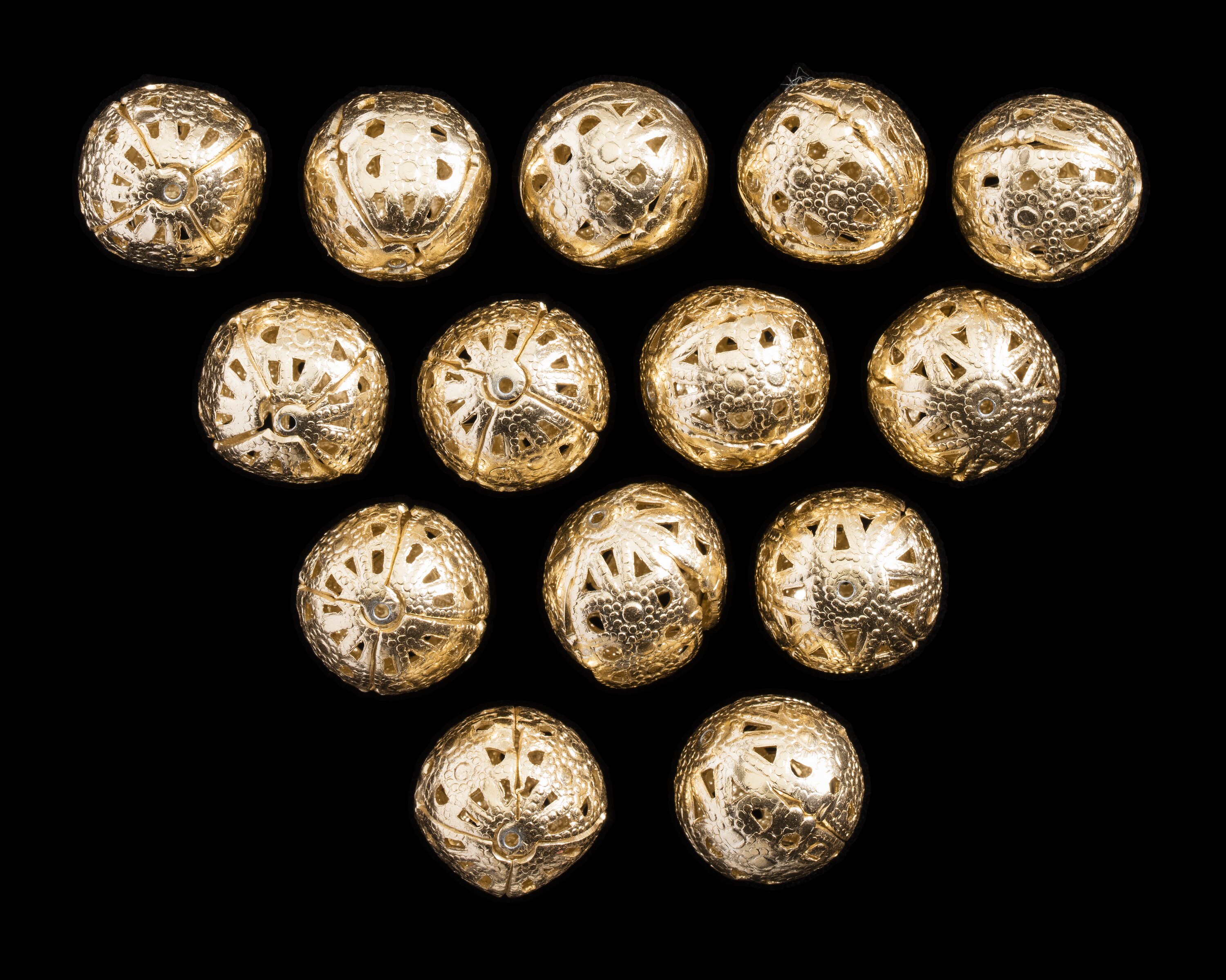 14 round gold metal baubles with small holes.
