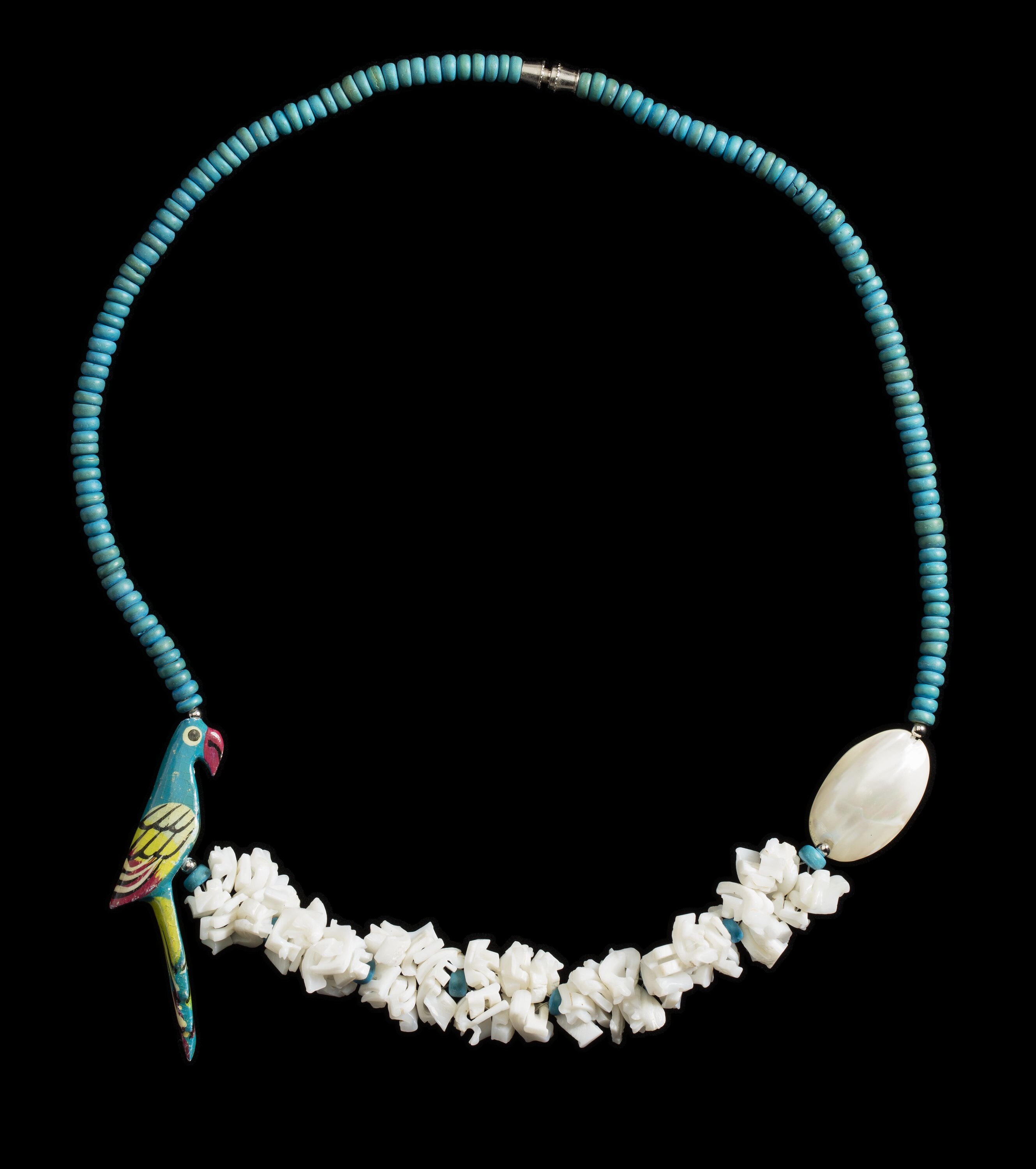 Blue coral and white shell necklace with a parrot decoration on one side, worn by Bernice Kopple possibly as part of one of her cabaret acts between the 1960s and 1970s. Bernice migrated from Scotland to Australia in 1950.