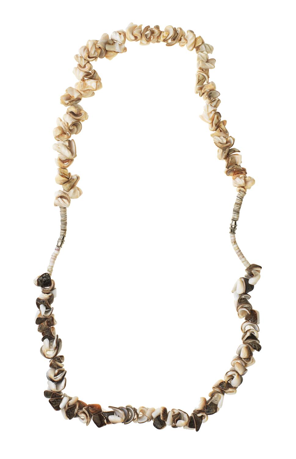 Necklace consisting of large pieces of broken shell strung along length of necklace, shell pieces matching on each side. there are two screw clasps enabling the necklace to be worn at two different lengths.