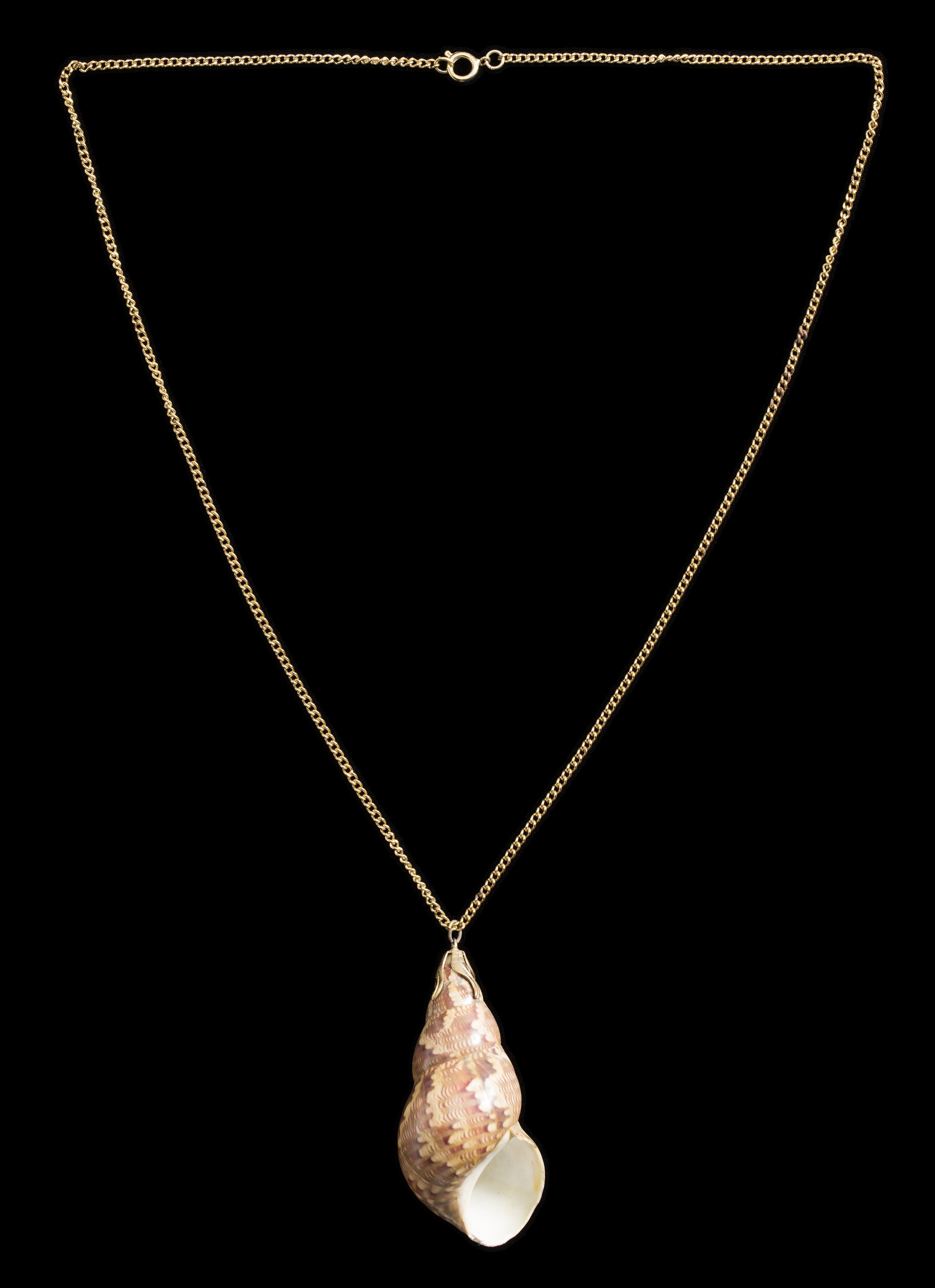 Necklace with a single large mollusc shell attached to a gold chain, worn by Bernice Kopple possibly as part of one of her cabaret acts between the 1960s and 1970s. Bernice migrated from Scotland to Australia in 1950.