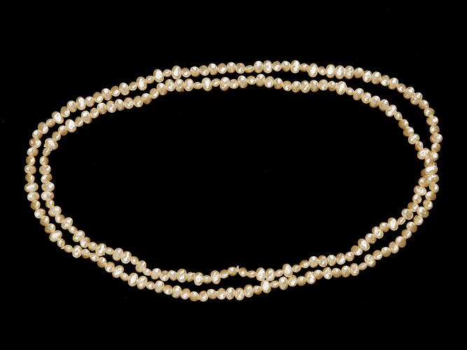 Single strand, regular shaped, pearl necklace worn by Bernice Kopple between the 1960s and 1970s. There are also two matching pearl bracelets (HT38821). Bernice migrated from Scotland to Australia in 1950.